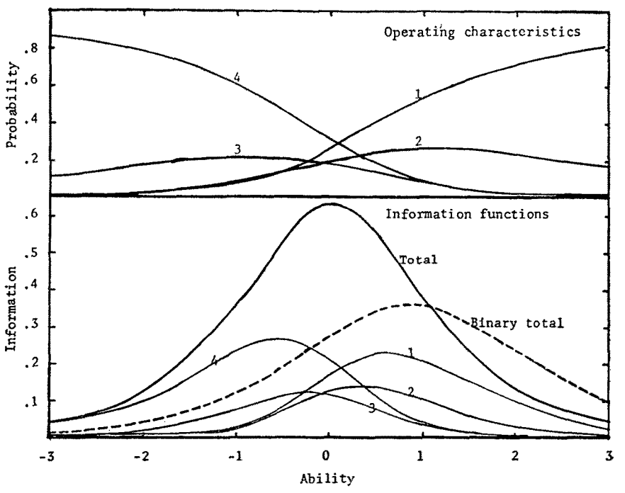 A multivariate logistic latent trait model for items scored in two or more nominal categories is proposed. Statistical methods based on the model provide 1) estimation of two item parameters for each response alternative of each multiple choice item and 2) recovery of information from “wrong” responses when estimating latent ability. An application to a large sample of data for twenty vocabulary items shows excellent fit of the model according to a chi-square criterion. Item and test information curves are compared for estimation of ability assuming multiple category and dichotomous scoring of these items. Multiple scoring proves substantially more precise for subjects of less than median ability, and about equally precise for subjects above the median.